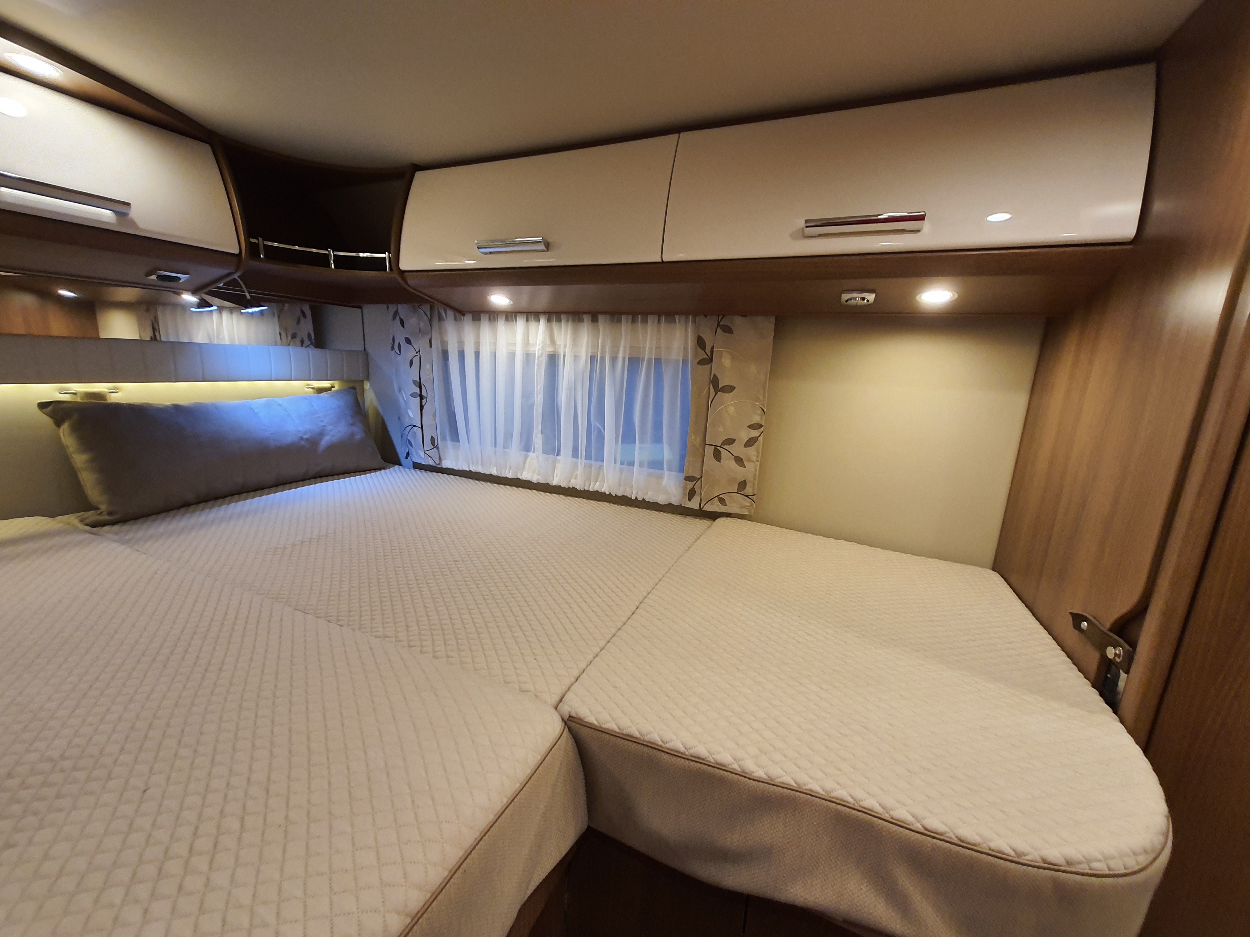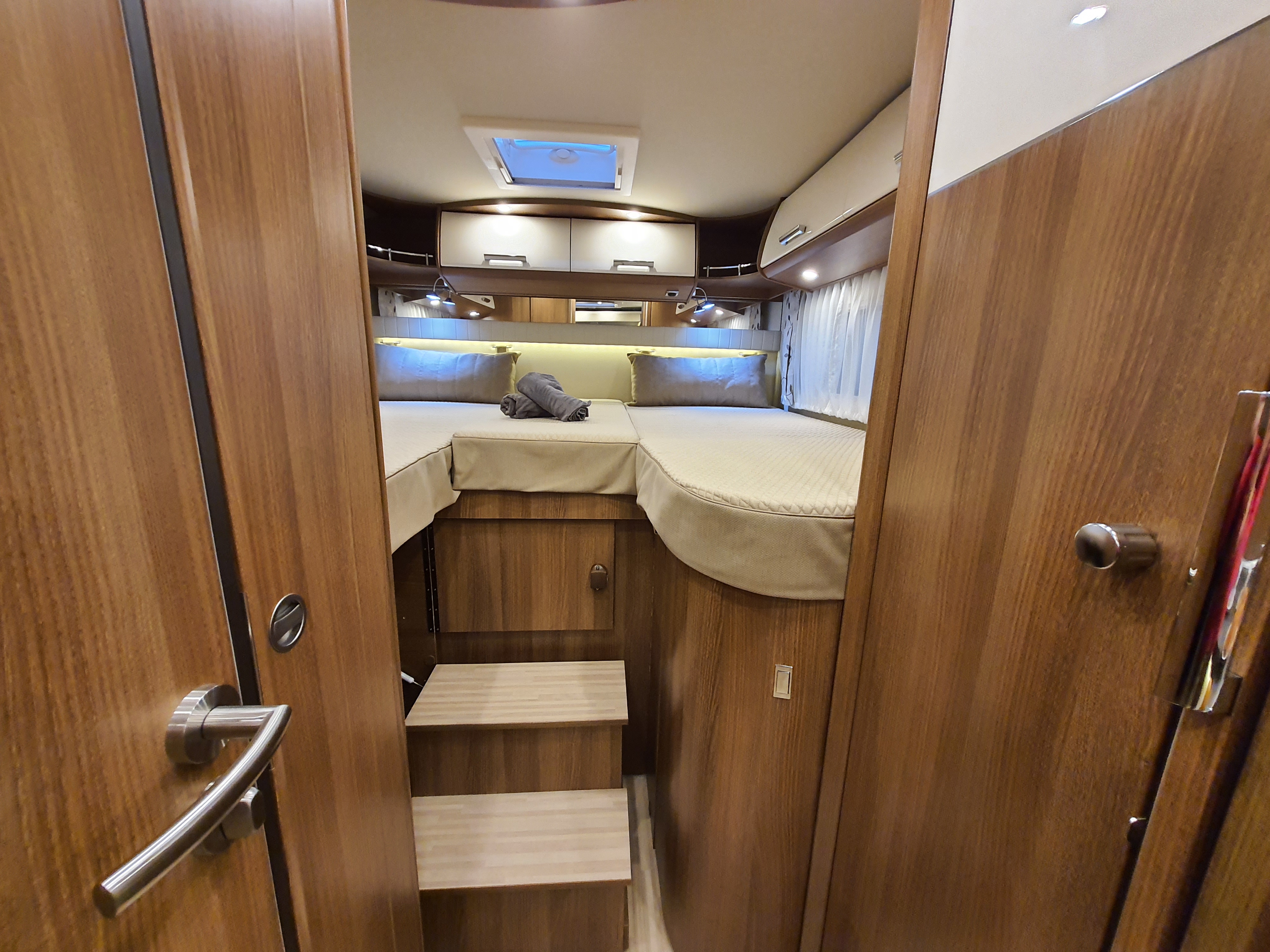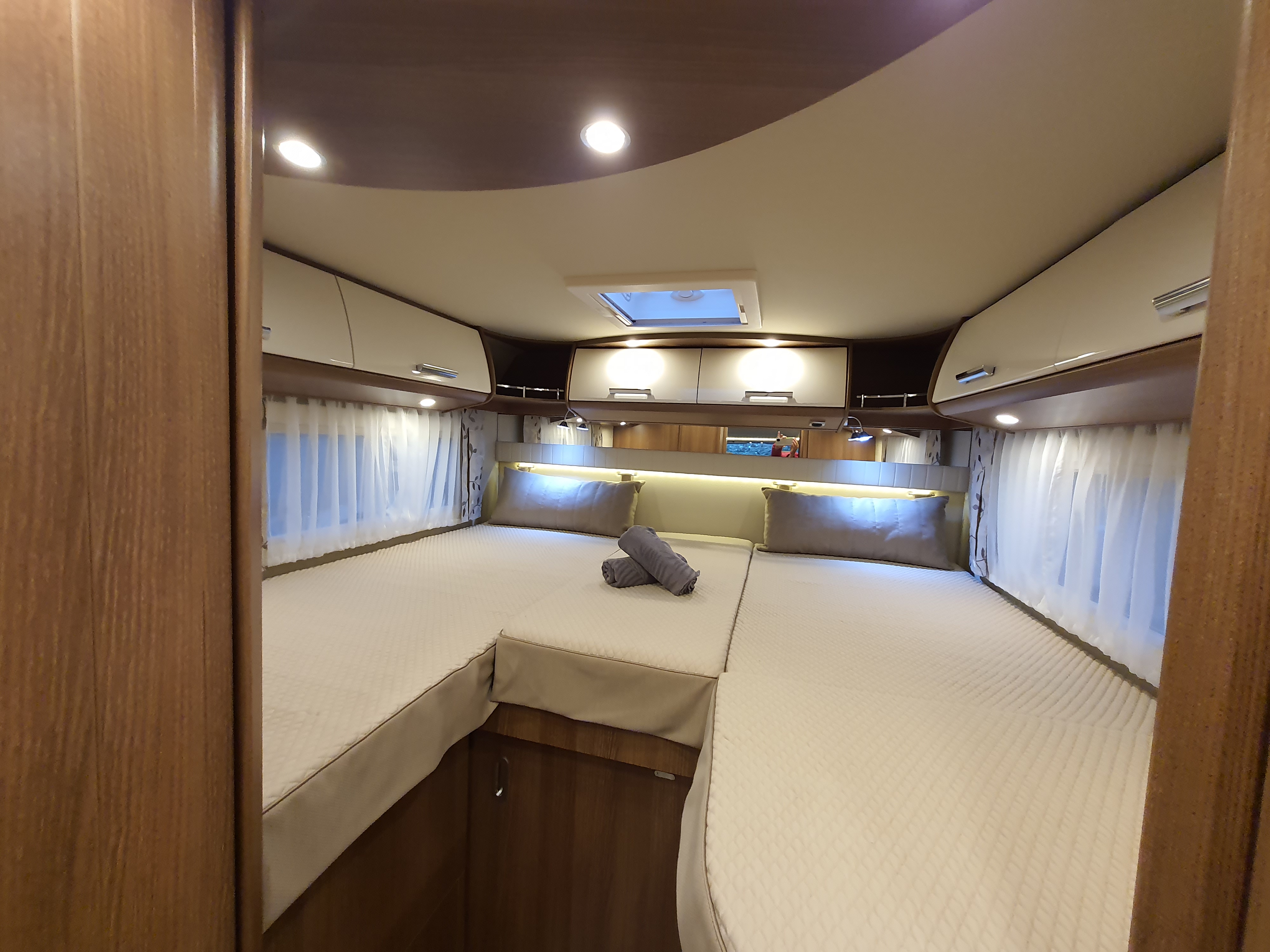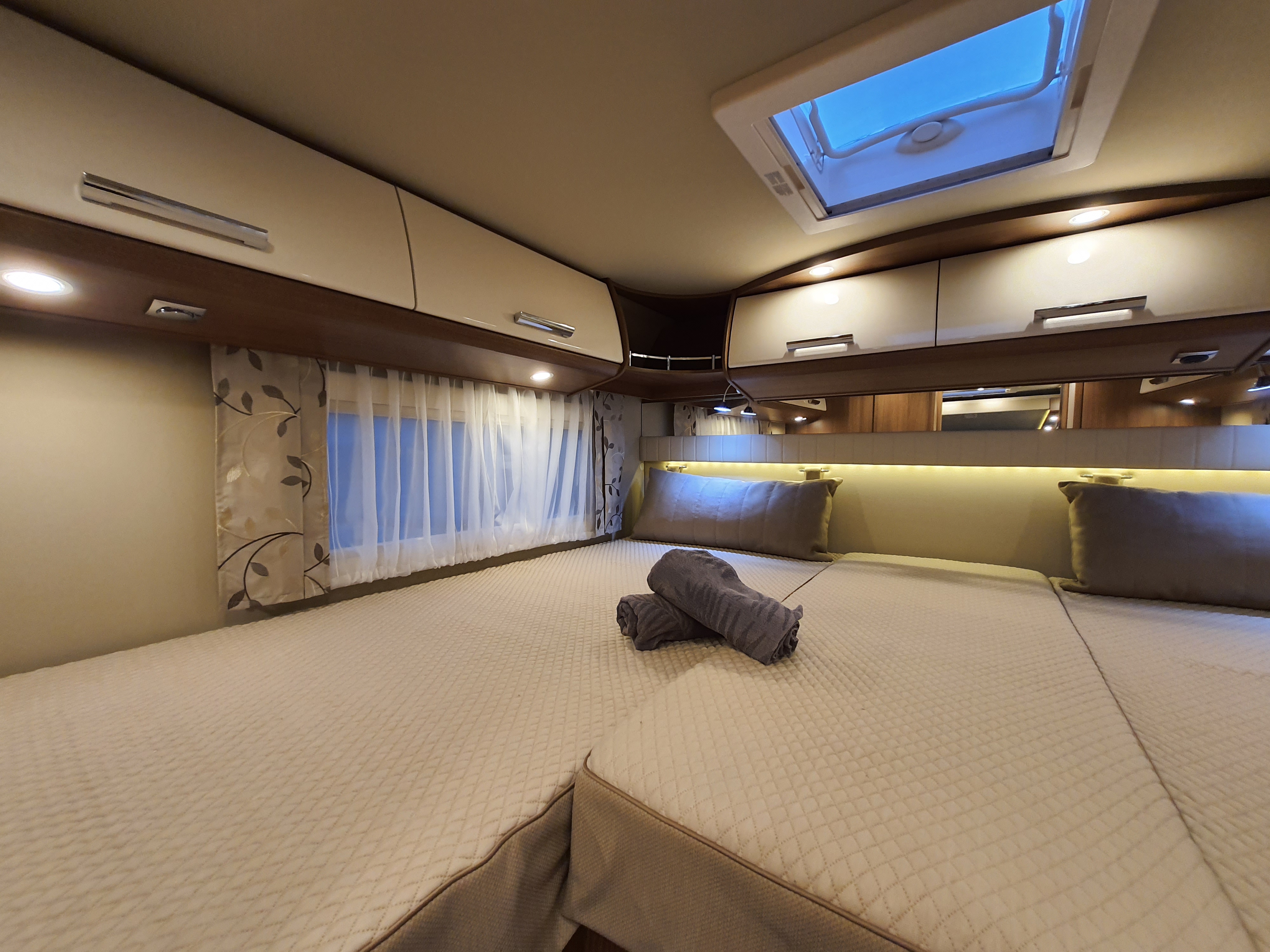 Fiat Ducato 2,3l, 160k, 118kw, airbag pro řidiče i spolujezdce, elektrická zpětná zrcátka vyhřívaná, tempomat, automatická klimatizace. Velké množství úložného prostoru a to včetně dvojí podlahy. Topení je plynové 2x propanová bomba 11kg s automatickým přepínáním (Duo Control), velká lednice o objemu 160l s odděleným mrazákem. Obytný vůz je určen pro 4 lidi na jízdu i spaní.