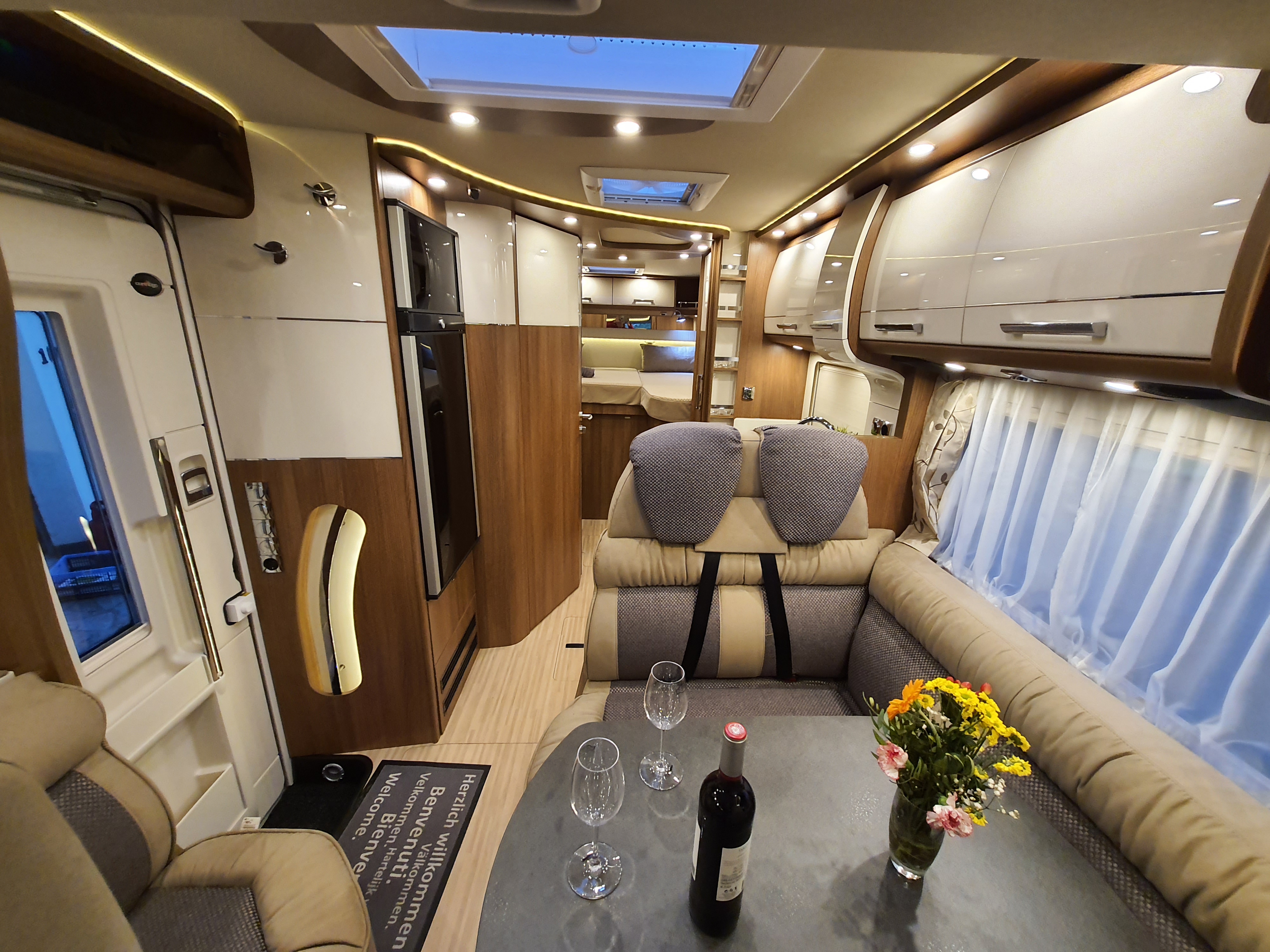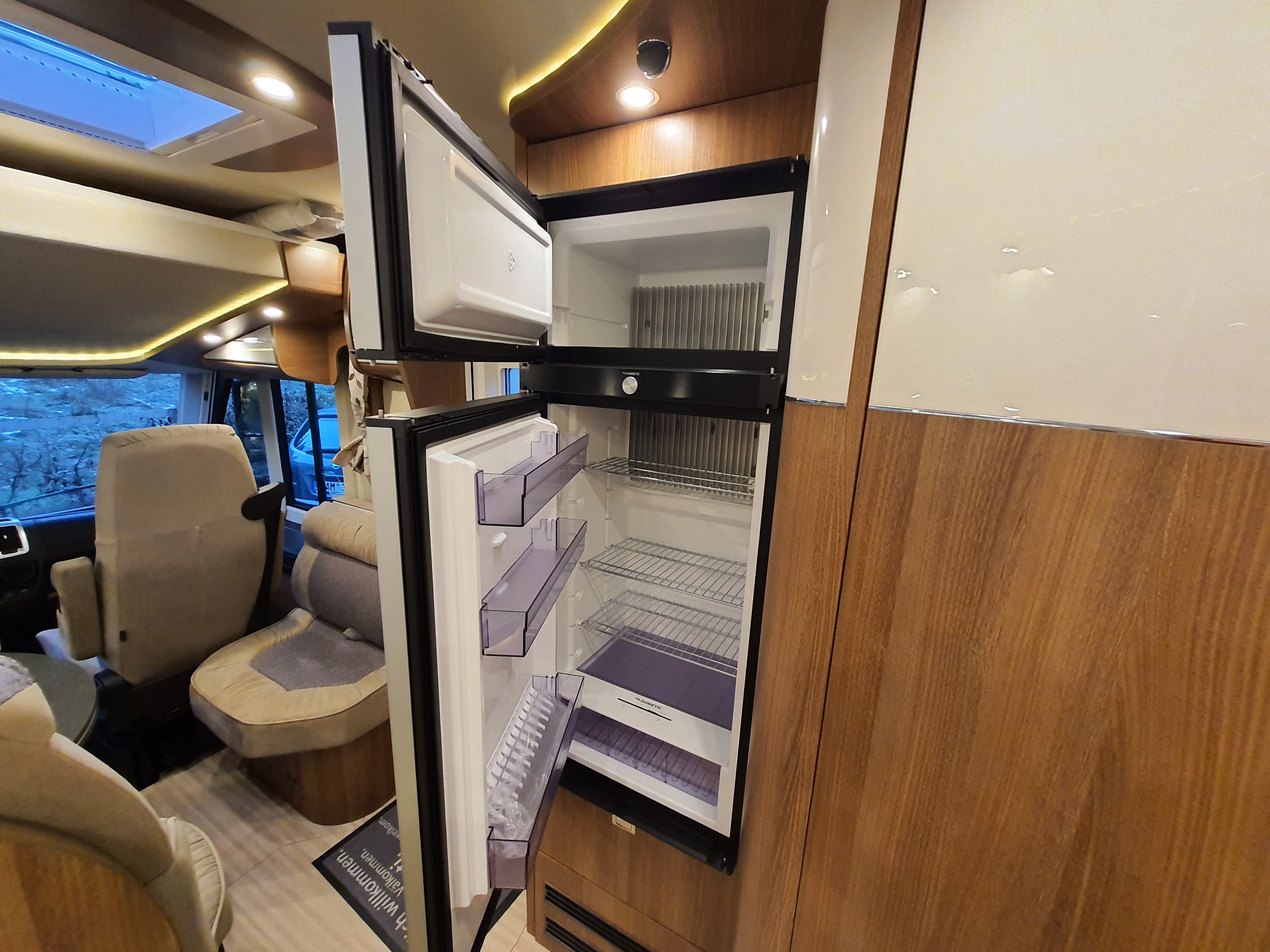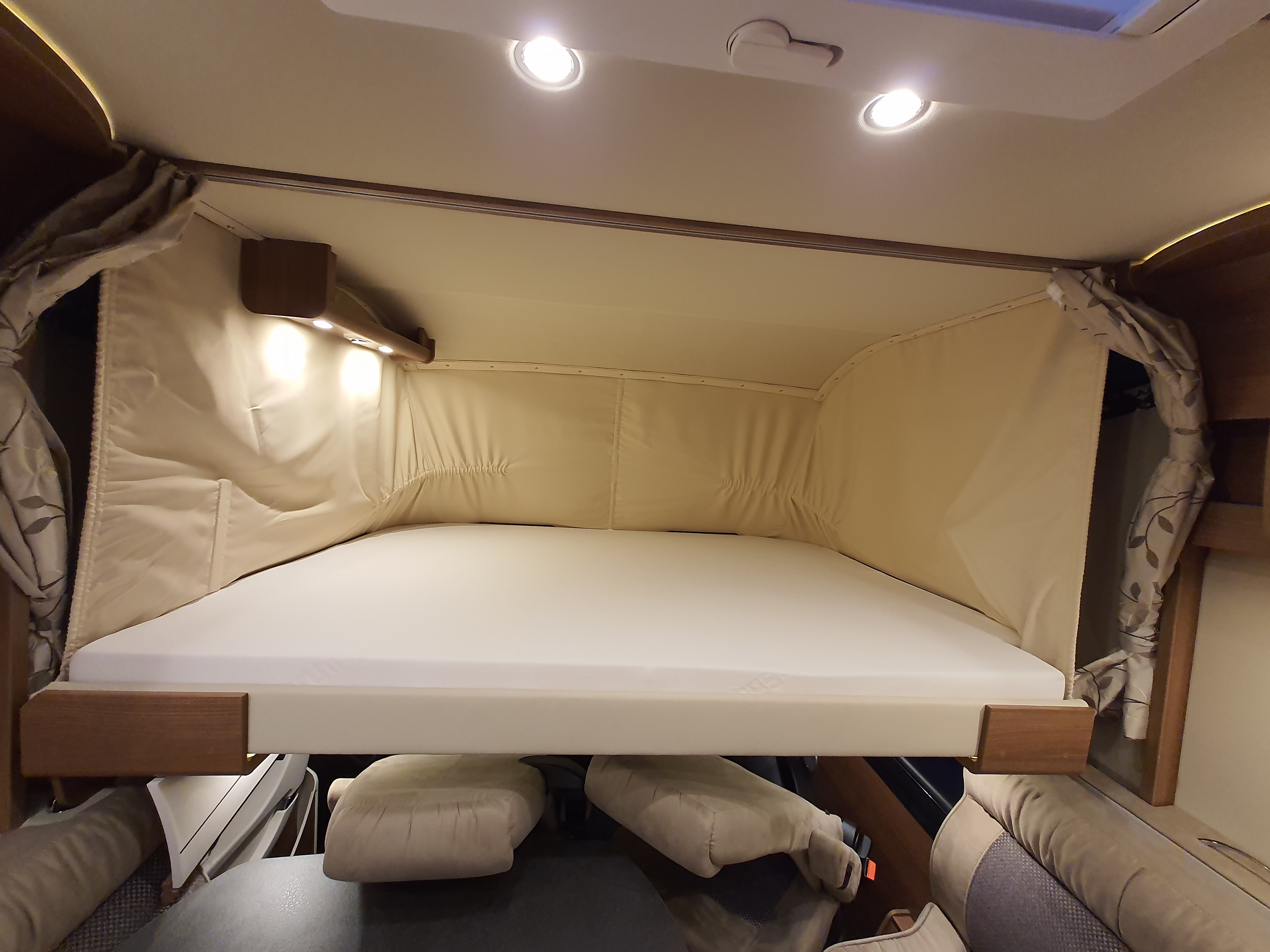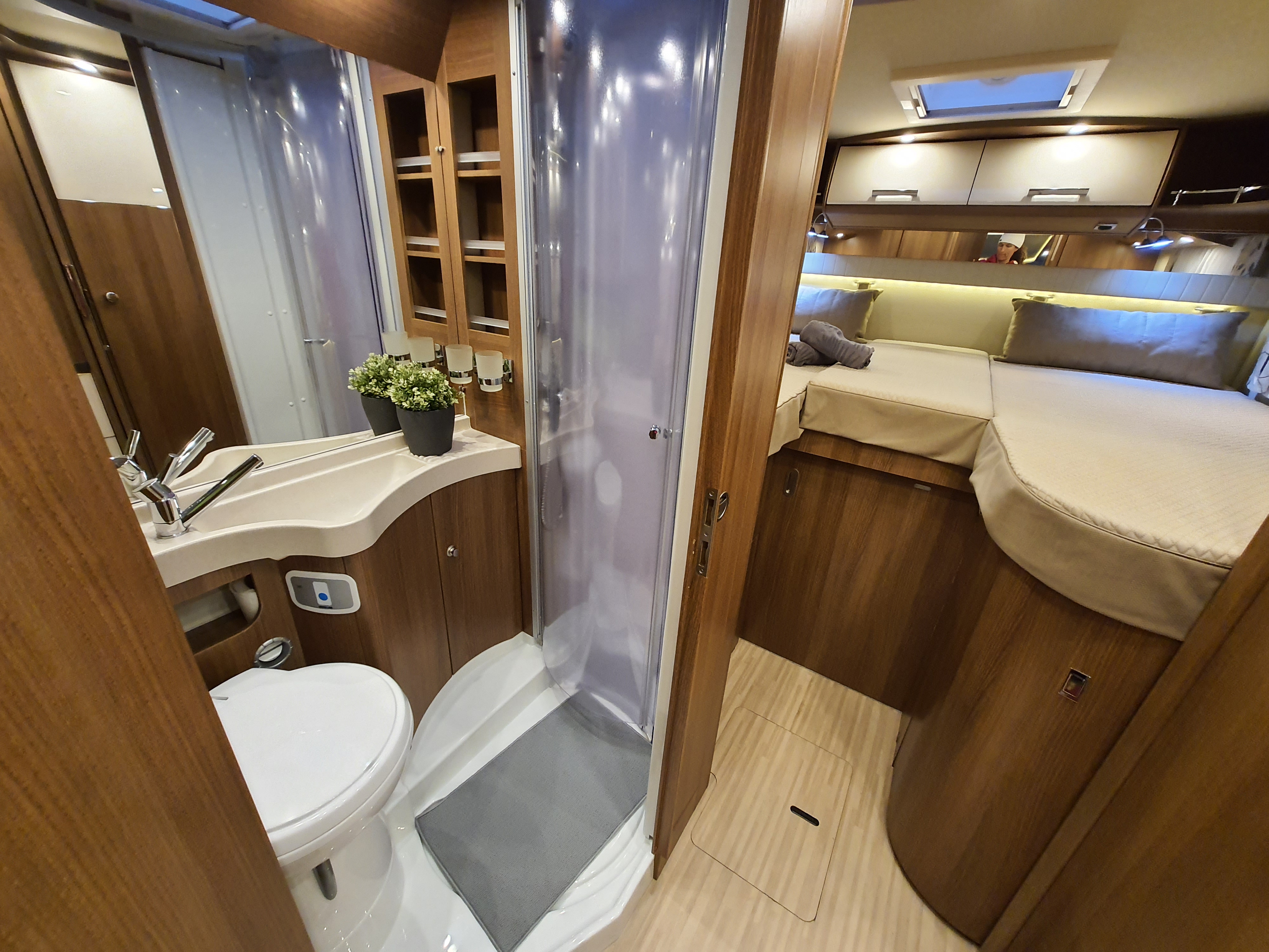 Fiat Ducato 2,3l, 160k, 118kw, airbag pro řidiče i spolujezdce, elektrická zpětná zrcátka vyhřívaná, tempomat, automatická klimatizace. Velké množství úložného prostoru a to včetně dvojí podlahy. Topení je plynové 2x propanová bomba 11kg s automatickým přepínáním (Duo Control), velká lednice o objemu 160l s odděleným mrazákem. Obytný vůz je určen pro 4 lidi na jízdu i spaní.
