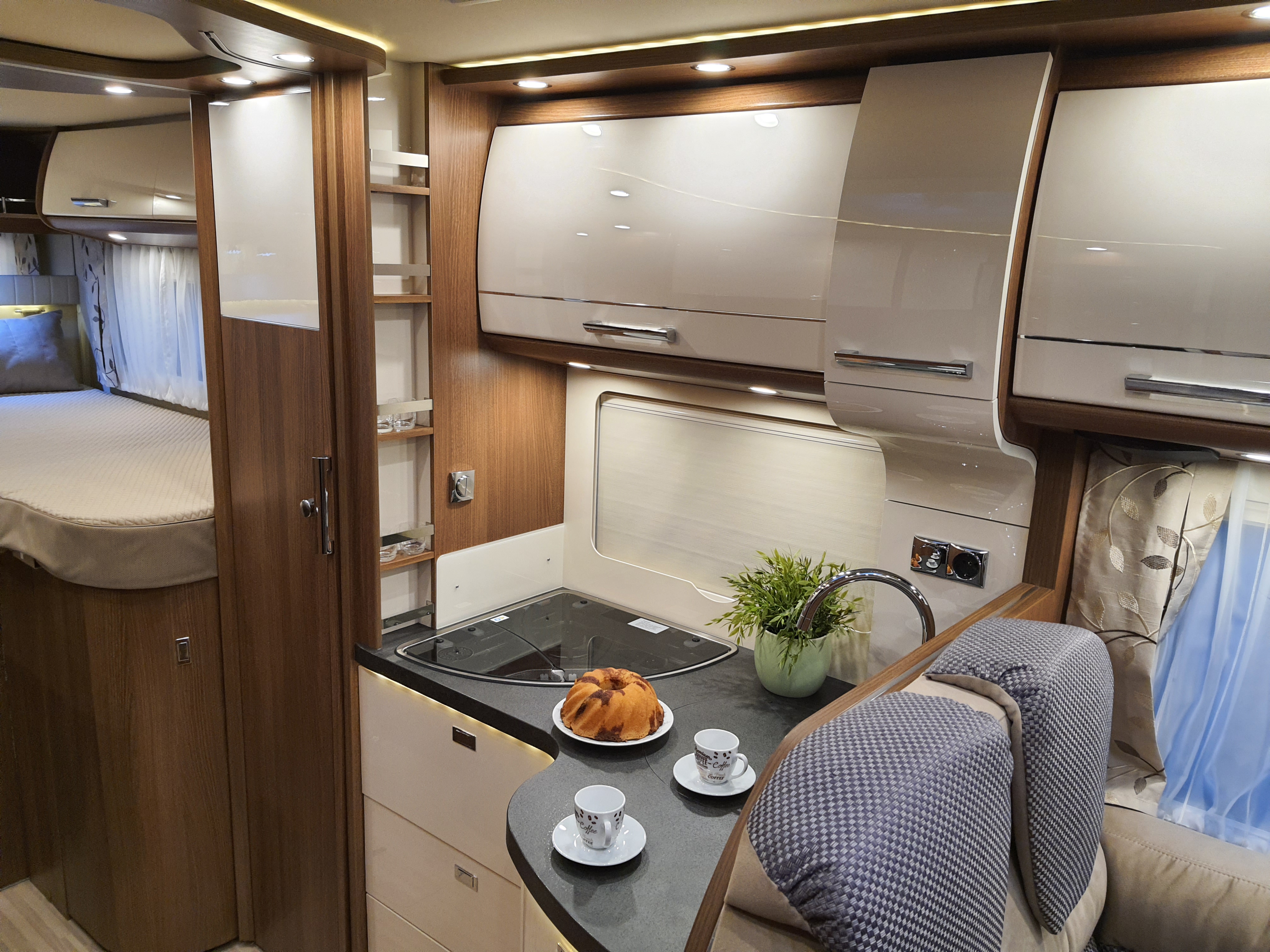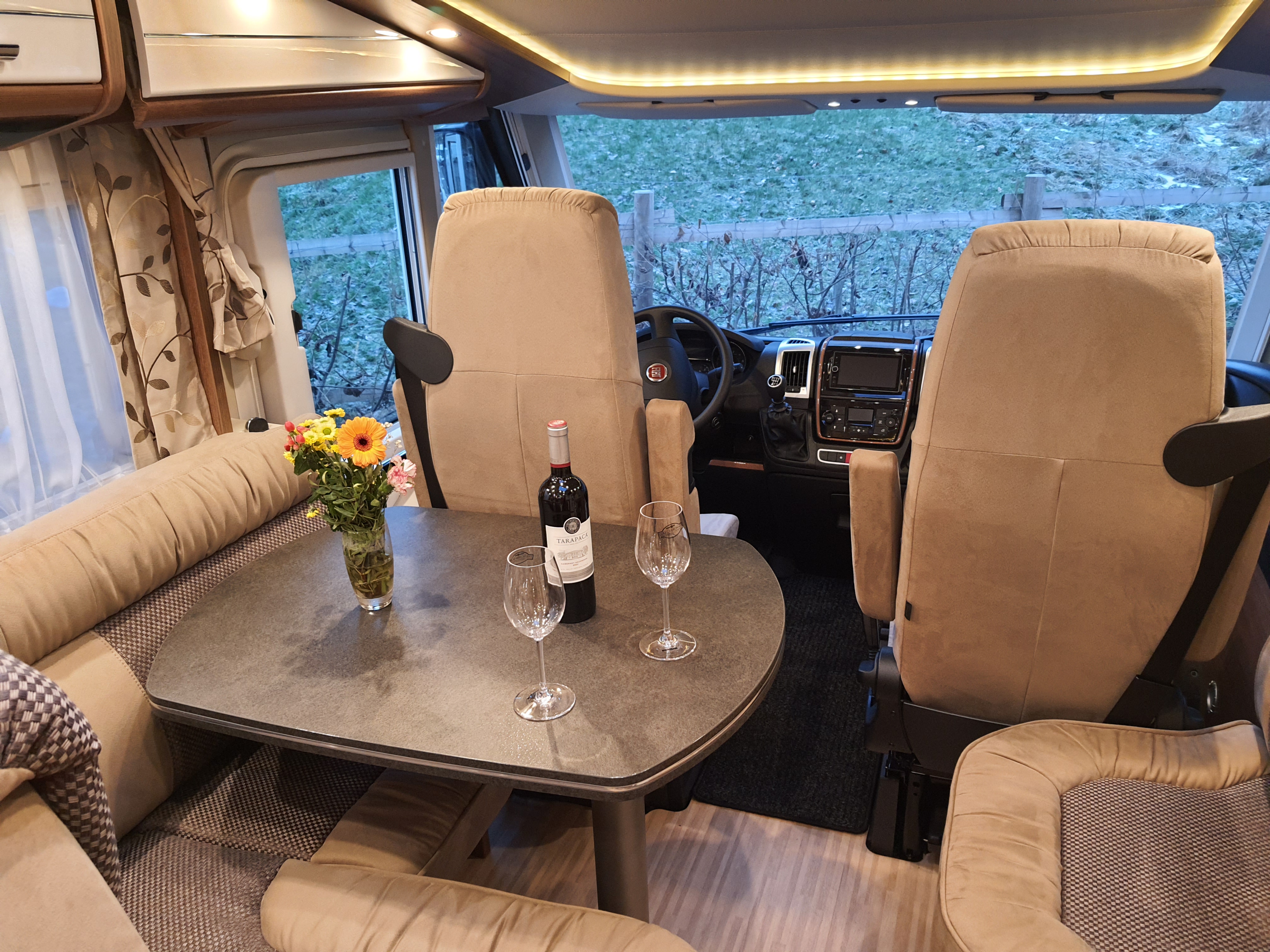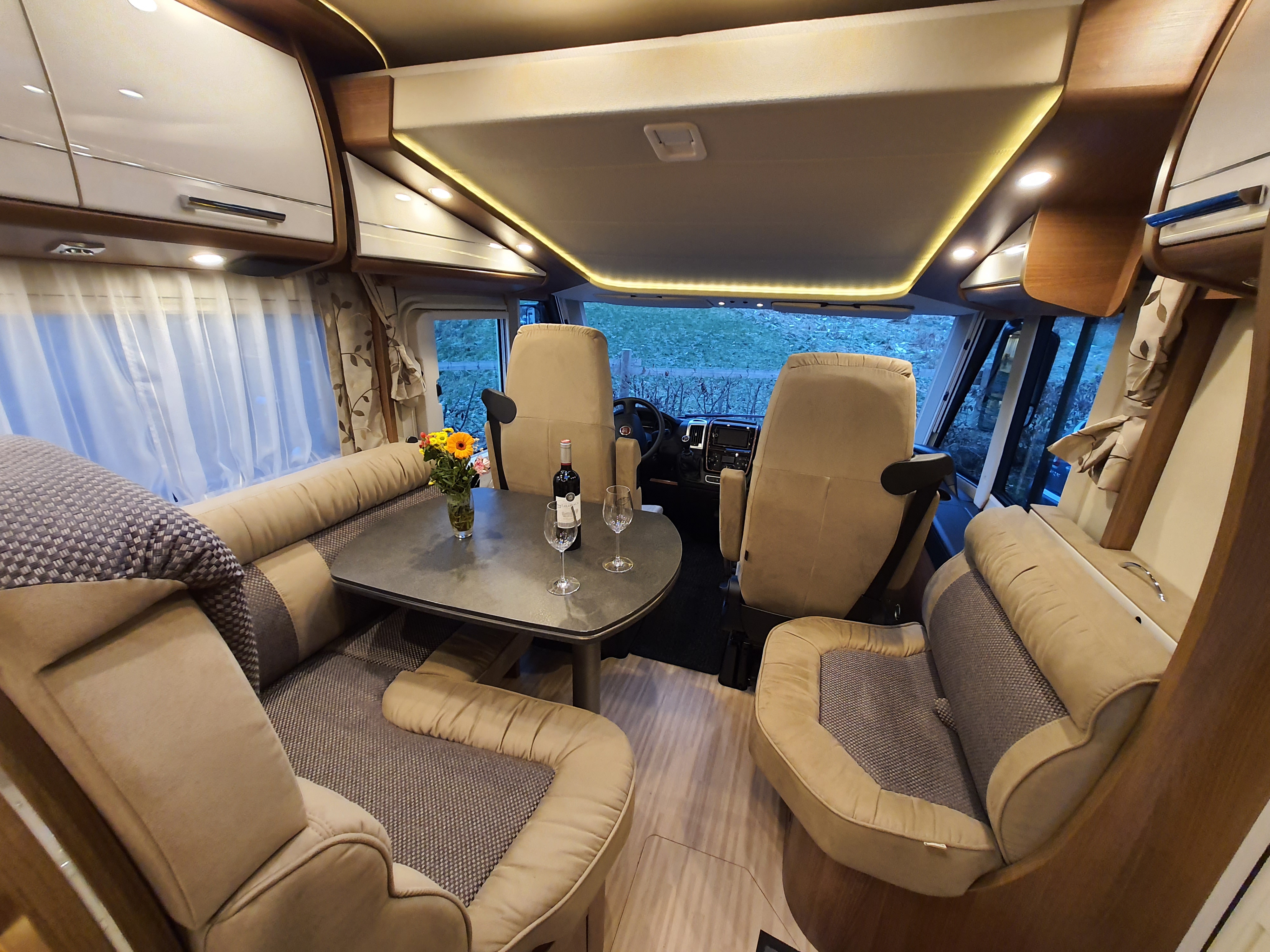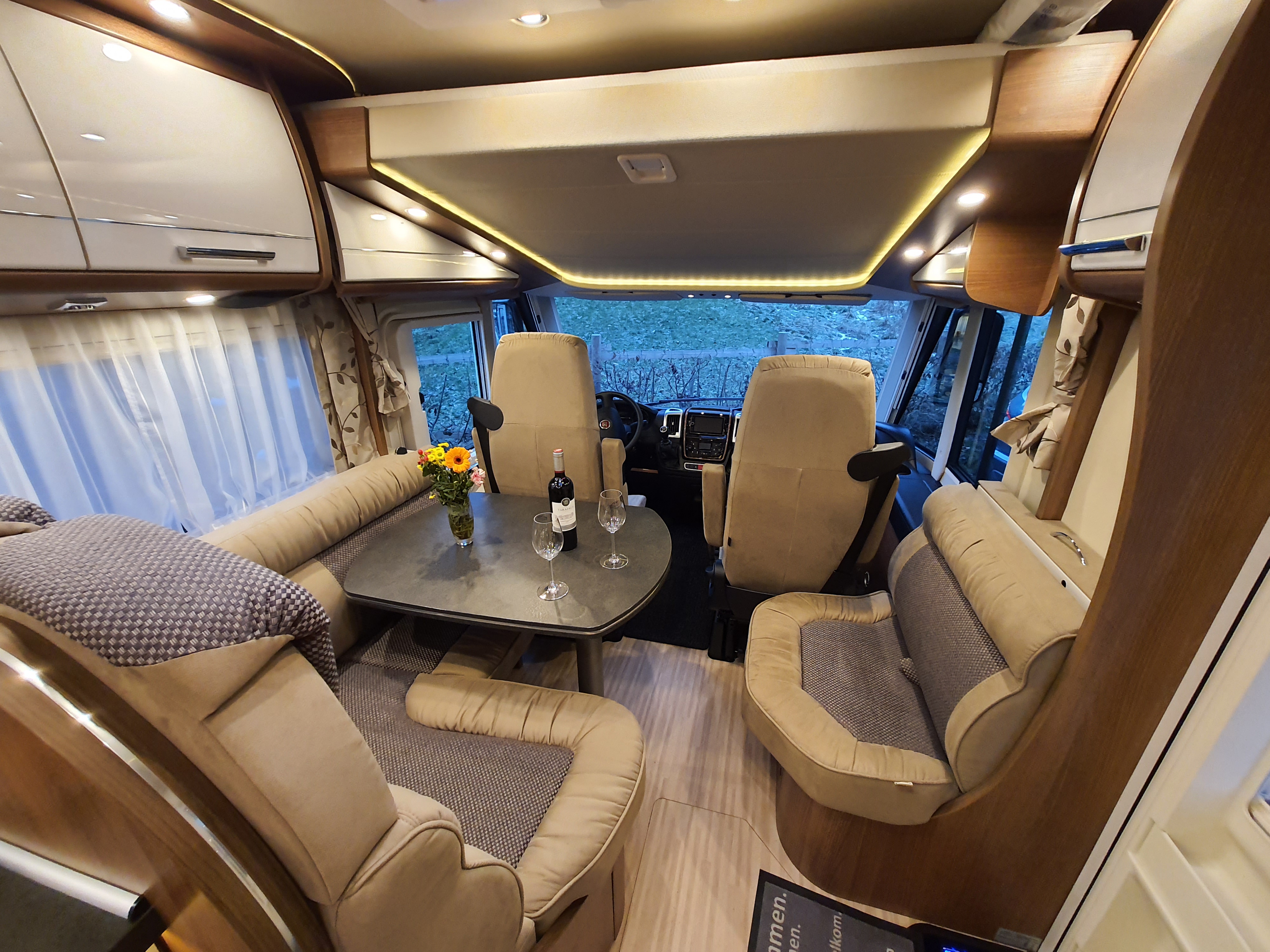 Fiat Ducato 2,3l, 160k, 118kw, airbag pro řidiče i spolujezdce, elektrická zpětná zrcátka vyhřívaná, tempomat, automatická klimatizace. Velké množství úložného prostoru a to včetně dvojí podlahy. Topení je plynové 2x propanová bomba 11kg s automatickým přepínáním (Duo Control), velká lednice o objemu 160l s odděleným mrazákem. Obytný vůz je určen pro 4 lidi na jízdu i spaní.