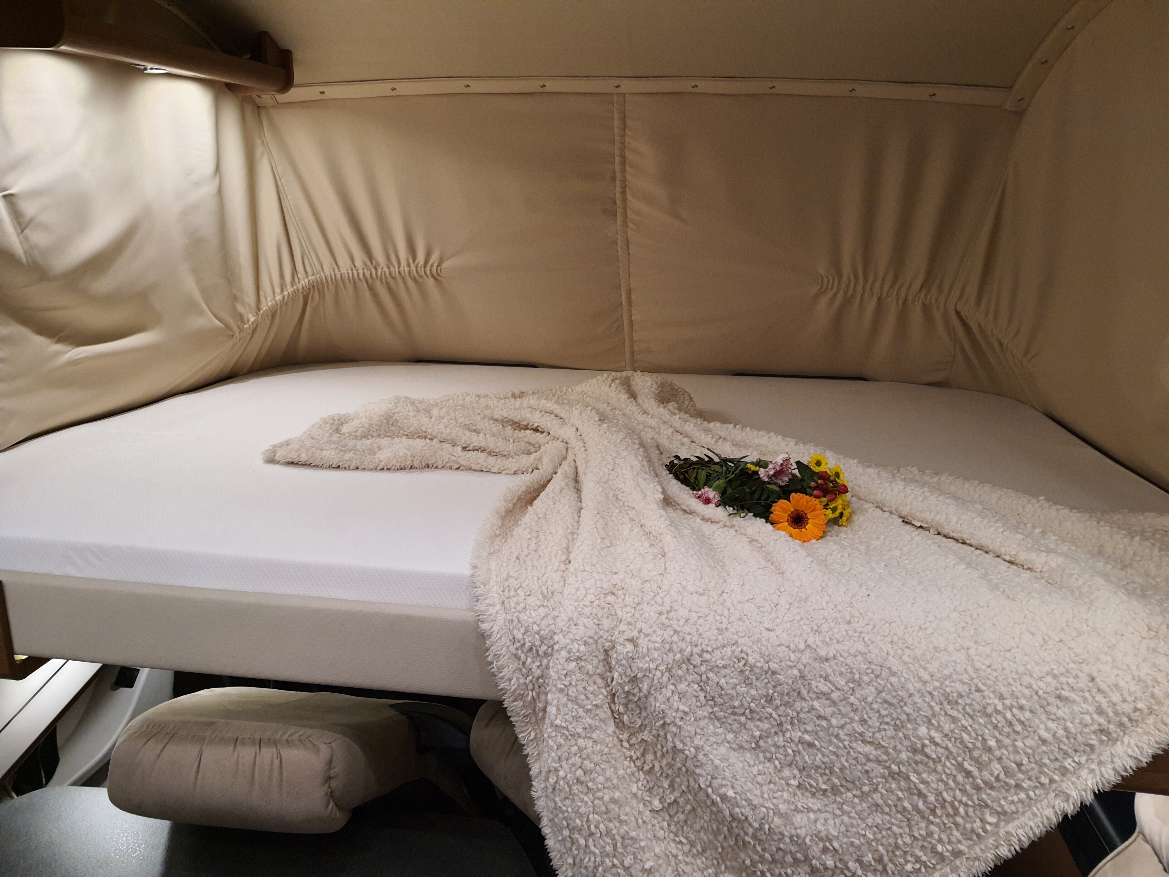 Také je vše připraveno pro spaní: polštáře, peřiny, prostěradla i povlečení, včetně ručníků a utěrek. K dispozici jsou také čistící a úklidové prostředky, drobné nářadí a nájezdové klíny. Vůz je chráněn 2 nezávislými zámky ve dveřích.